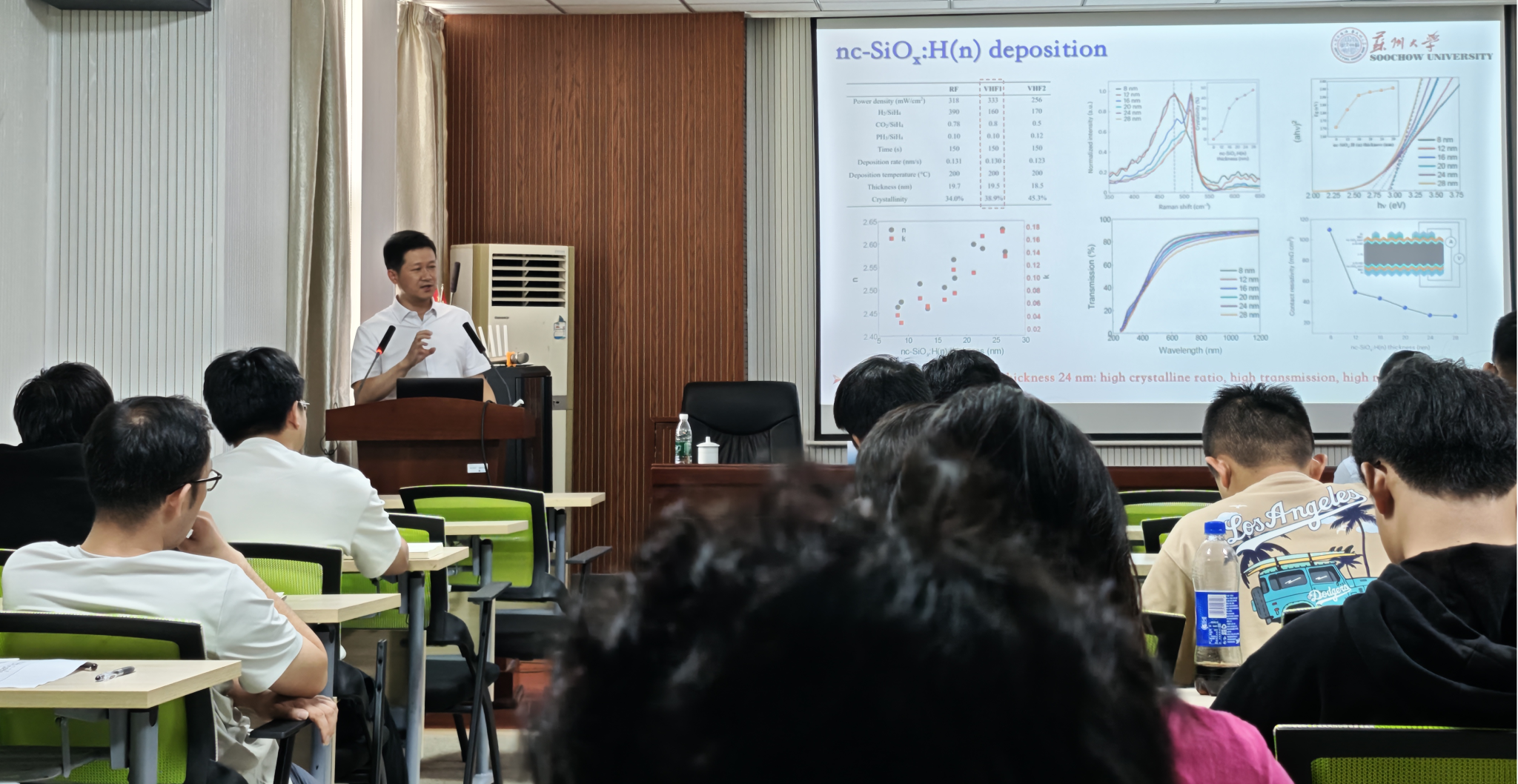 杨新波教授在报告会上重点介绍所在团队在高效晶硅电池和钙钛矿/晶硅叠层电池方面的研究进展。 杨新波教授团队设计和研发了具有最小化驻波效应的工业规模甚高频等离子体增强化学气相沉积系统,实现了透过率高、钝化接触性能优异的微晶硅氧窗口层薄膜的大面积均匀沉积,结合先进的无种子层铜电镀技术,在工业尺寸双面异质结电池上实现26.41%认证转换效率;进一步开发了高载流子迁移率的铈-氢共掺杂氧化铟(ICO:H)透明电极,实现了26.6%的认证转换效率。基于上述高效异质结底电池,结合开发了基于硫氰化亚铜-宽带隙钙钛矿共沉积技术和大绒面保型沉积技术的高效叠层电池,分别实现了31.5%和33%的认证转换效率。