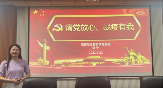 6月22日,信息与计算科学支部在定海楼512开展“请党放心、战疫有我”微党课,参加此次会议的有公司副经理孙靖、支部全体教师党员。