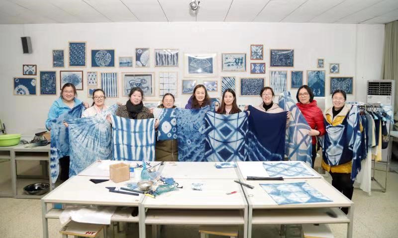 本次活动主要有参观染坊展厅和体验制作两个环节。王栋老师首先向大家介绍了工作室植物染的发展情况并带大家参观了染坊,展示了染坊的制作精品。然后介绍了几种扎染的制作手法,带领女教工们制作体验这一传统技法。在学会了基本的染织技法,完成了第一件作品后,老师们积极创新,染出来各式的新图案,女教工们对自己亲手染制的作品都很满意。