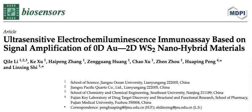 6.Biosensors-Basel:纳米杂化材料0DAu-2D WS2信号放大的超灵敏电化学发光免疫分析