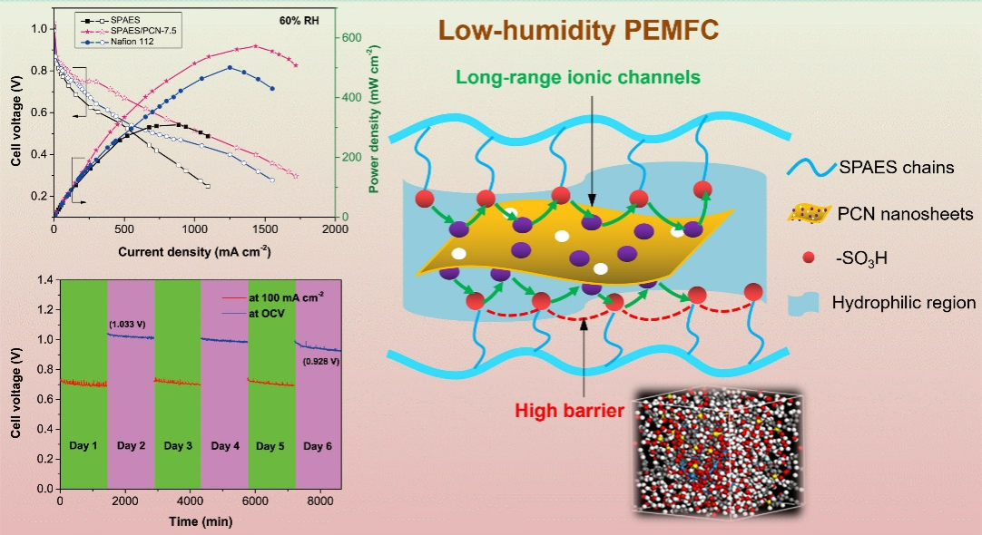 bevictor伟德官网光电转换能源材料与器件课题设计并合成了一种表面HPW以化学键接枝到介孔氮化碳(CN)纳米片作为不溶性HPW/CN(PCN)纳米填料对SPAES膜进行掺杂改性。在复合膜中,PCN纳米片和SPAES聚合物之间形成氢键作用和酸碱作用,这种相互作用诱导膜内的亲水离子簇沿纳米片层界面处聚集,形成长程连续的质子传输通道,这大大提升了复合膜的吸水率和质子传导率。同时由于HPW的强酸性和强吸水保水能力,在膜内形成“假液相”行为,显著提升了复合膜在低湿度下的质子传导率和电池性能。重要的是,PCN纳米片上的氨基与聚合物的磺酸基团形成类交联结构,大幅提高了膜的机械性能、尺寸稳定性、燃料阻隔性和耐久性。其中,SPAES/PCN-7.5复合膜性能最优,其质子传导率在低湿度下显著提升,且该膜在80℃和100%/50%RHs下的H2/O2燃料电池最大功率密度达到824/404 mW/cm2,远高于原始SPAES膜和略高于商业Nafion®112膜。经加速降解实验后,SPAES/PCN-7.5复合膜仍然保持稳定的电压和电池性能,以及更低的氢气渗透性。