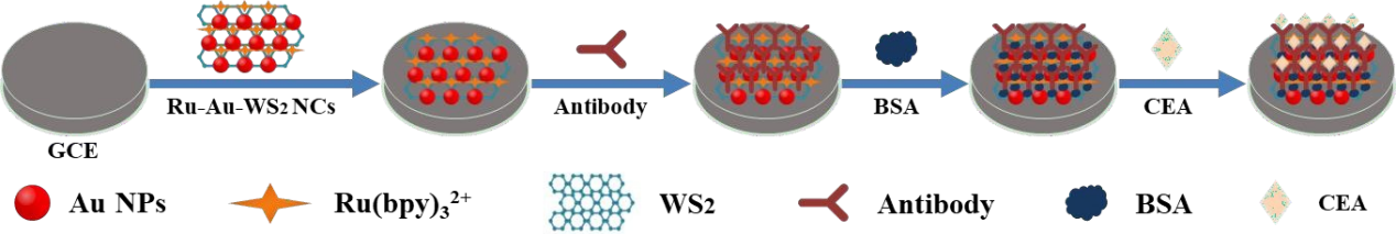 bevictor伟德官网光电转换能源材料与器件课题组报道了钌金纳米晶的ECL免疫分析法。二维(2D)石墨烯状材料利用其在水溶液的高分散性,对生物分子的高装载效率和良好的生物相容性制成一种由0D金纳米颗粒、2D WS2纳米片和Ru(bpy)3Cl2组成的混合Ru- Au-WS2纳米晶。ECL作为一种经典的传感技术,因其电流的输入信号和光的输出信号是完全分离,而具有高灵敏度、此外高选择性、高灵敏度、快速响应和低背景信号特性使得其成为一种强有力的分析工具。