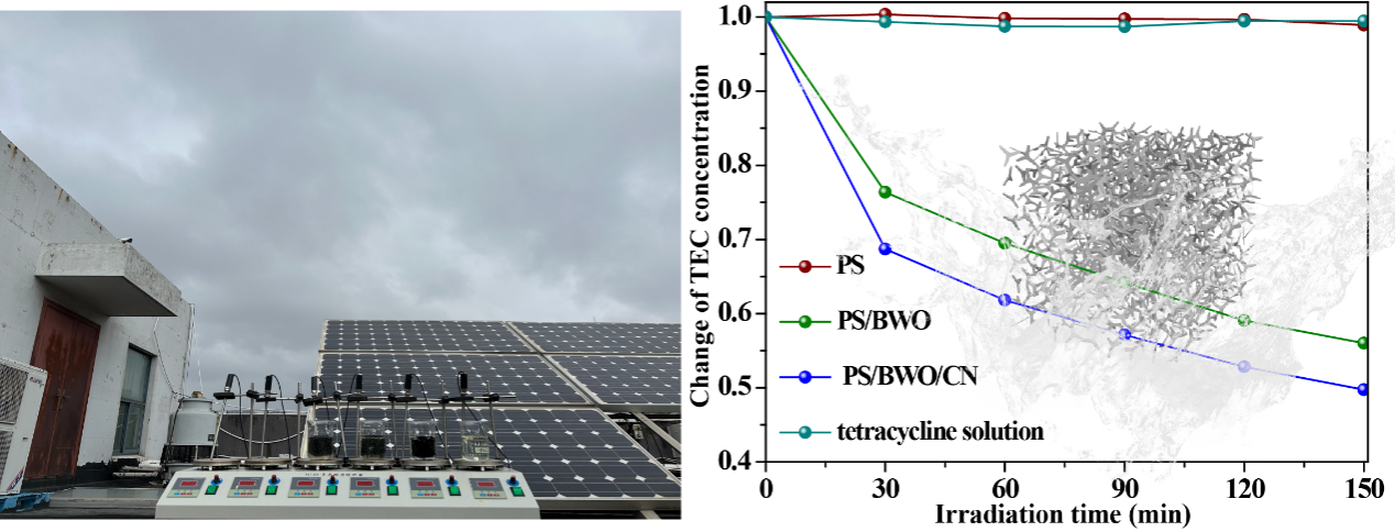 在上一个工作中,虽然通过表面活性剂辅助的一步水热法制备了室外不同天气下响应的Bi2WO6基异质结催化剂,然而样品粉末的回收问题限制了其商业化应用。bevictor伟德官网光电转换能源材料与器件课题组通过水热法和焙烧法合成了Bi2WO6/g-C3N4异质结,并引入三维的聚氨酯海绵来辅助催化剂粉末。一方面,天气变化对Bi2WO6样品的影响较小,在弱的太阳光下依然表现出高效的光催化活性。此外,Bi2WO6/g-C3N4异质结的构建加快了光生载流子的分离和转移,提高了Bi2WO6的催化性能。在室外多云(大阳能功率密度21.93~52.97mW/cm2)甚至阴天(大阳能功率密度3.66~18.99 mW/m2)条件都表现出良好的污染物降解性能。在太阳光照射150分钟后,Bi2WO6/g-C3N4对四环素的降解率分别达到64.66%和55.19%。另一方面,催化剂粉末通过聚氨酯防水涂料紧密地负载在聚氨酯海绵表面,从而便于材料回收和重复利用。经过4次循环后,Bi2WO6/g-C3N4对四环素的降解率没有明显下降,节约了反应成本,对水环境没有二次污染。
