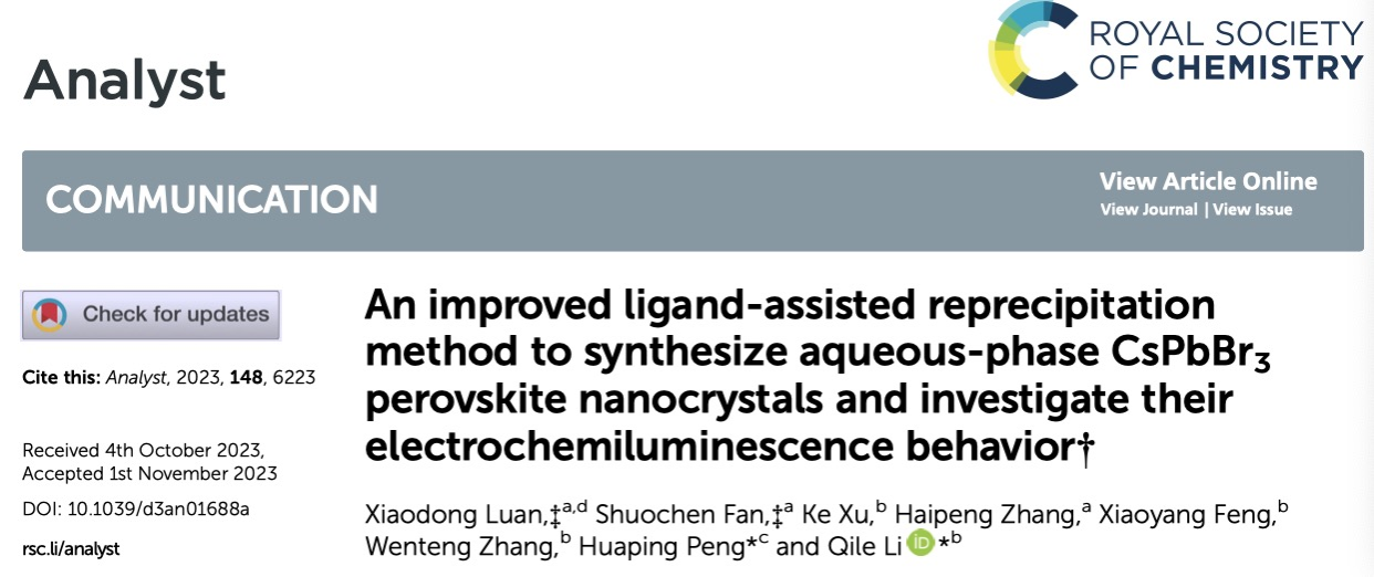 5.Analyst:一种改进配体辅助再沉淀法合成水相CsPbBr3钙钛矿纳米晶体并研究其电致化学发光行为