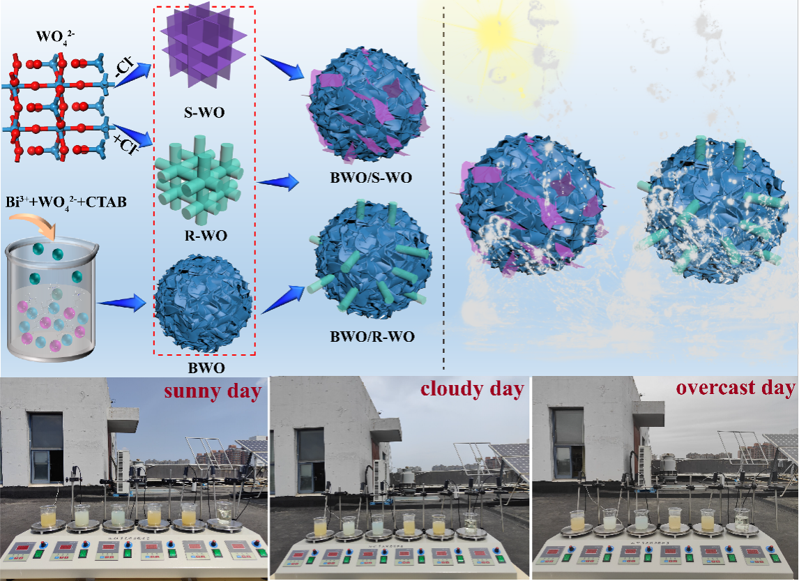 弱的光照强度和多变的气候条件限制了光催化技术在自然环境领域的实际应用。bevictor伟德官网光电转换能源材料与器件课题组设计制备了一种可在室外不稳定天气条件下使用的Bi2WO6/WO3异质结光催化剂。在这项工作中采用表面活性剂辅助法合成高效的Bi2WO6催化剂,在以室外自然环境的太阳光作为光源时,这种材料具有优越的光催化活性。此外,通过控制前驱体溶液中氯离子的含量,合成了棒状和片状WO3,并用于制备Bi2WO6/WO3异质结。与单一的Bi2WO6与WO3样品相比,Bi2WO6/WO3异质结无论是在晴天(光照强度为44.29~69.48 mW/cm2)还是多云天气(5.07~54.67mW/cm2),甚至在阴天(2.83~18.99mW/cm2)条件下,都表现出增强的光催化四环素降解性能,其在晴天和阴天光照150分钟后的降解效率分别为74.3%和54.2%。此外,Bi2WO6/WO3对甲基橙和罗丹明b也表现出良好的光降解性能,在光照50分钟后的降解率分别为63.7%和99.0%。