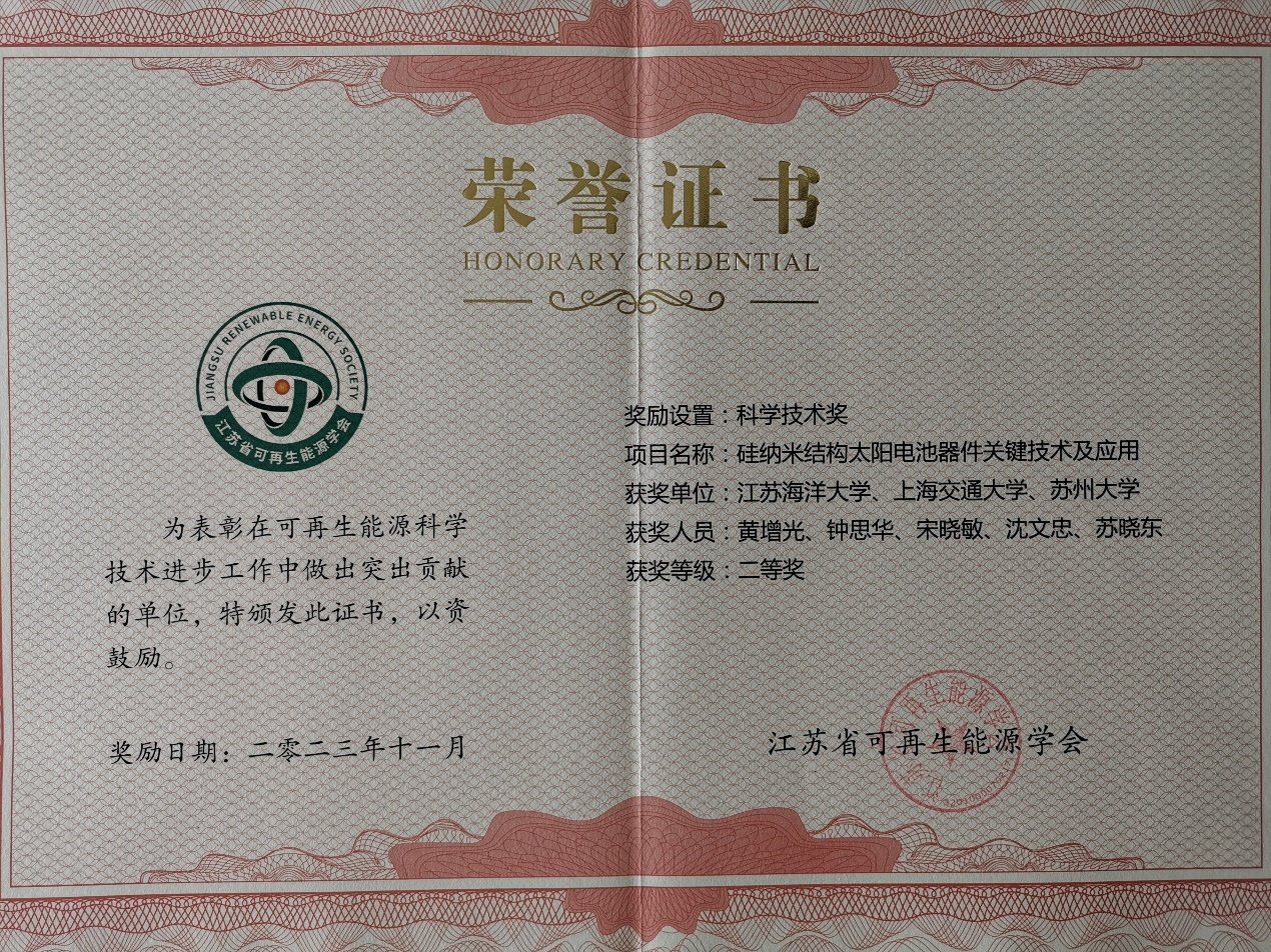 近日,江苏省可再生能源学会在南京举行2023年学会科学技术奖颁奖典礼,公司bevictor伟德官网黄增光教授团队项目“硅纳米结构太阳电池器件关键技术及应用”荣获科学技术二等奖,bevictor伟德官网为第一完成单位,bevictor伟德官网黄增光为第一完成人。