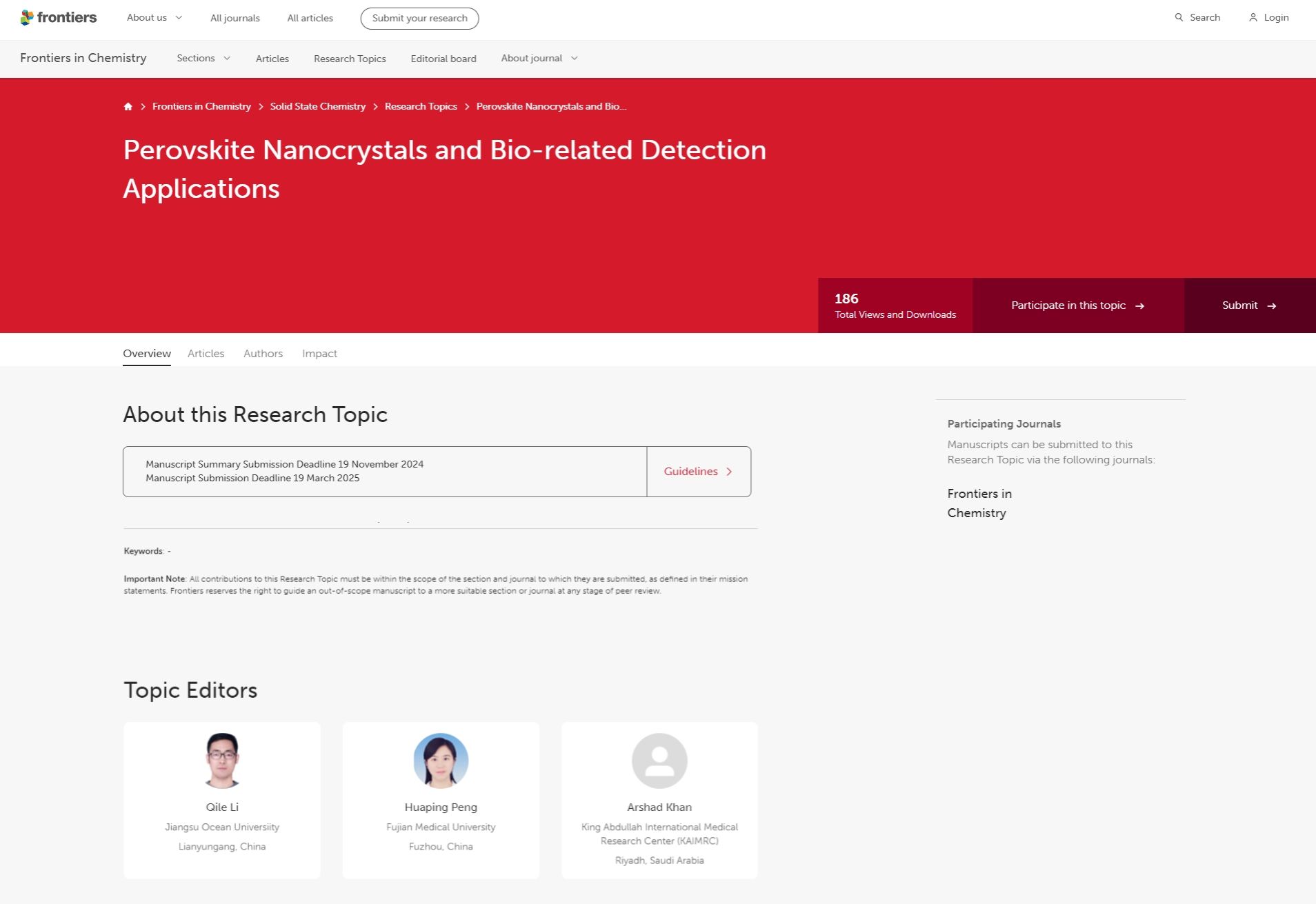 近日,bevictor伟德官网李其乐博士接受国际刊物《Frontiers in Chemistry》邀请,正式担任该刊客座编辑(Guest Editor),负责前沿专刊“Perovskite Nanocrystals and Bio-related Detection Applications”的稿件征集和同行评审工作。投稿链接https://www.frontiersin.org/research-topics/67270/perovskite-nanocrystals-and-bio-related-detection-applications