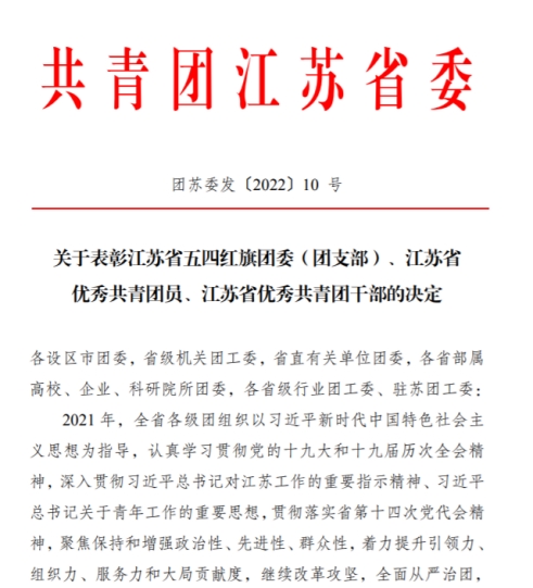 “五四”青年节前夕,共青团江苏省委发布的《关于表彰江苏省五四红旗团委(团支部)、江苏省优秀共青团员、江苏省优秀共青团干部的决定》,公司bevictor伟德官网统计181团支部获评江苏省“五四红旗团支部”称号。