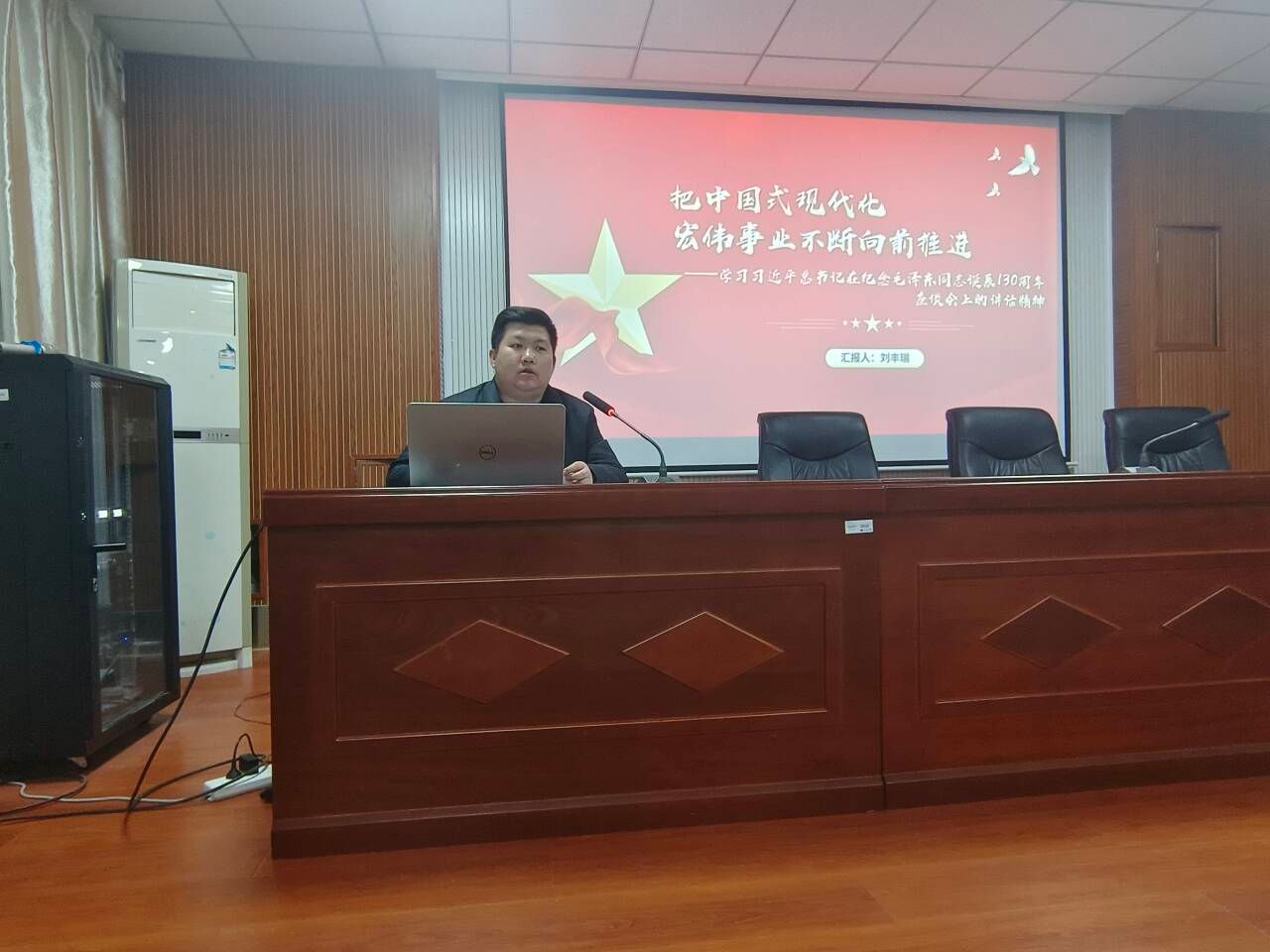 2023年12月26日,中共中央在北京人民大会堂举行纪念毛泽东同志诞辰130周年座谈会,习近平总书记发表重要讲话。习近平总书记号召新一代共产党人紧跟时代步伐,以实际行动把毛泽东同志等老一辈革命家所开创的事业继续推向前进,为以中国式现代化全面推进强国建设、民族复兴伟业而奋勇前进!在学习习近平总书记发表的重要讲话精神后,刘丰瑞老师说到,作为团学骨干,我们要顺应时代发展新趋势,秉持着改革到底的坚强决心,刀刃向内;要认真学习毛泽东思想,自觉发扬优良传统,回答时代课题。正如习近平总书记在纪念毛泽东同志诞辰130周年座谈会上强调的:“对毛泽东同志的最好纪念,就是把他开创的事业继续推向前进”。