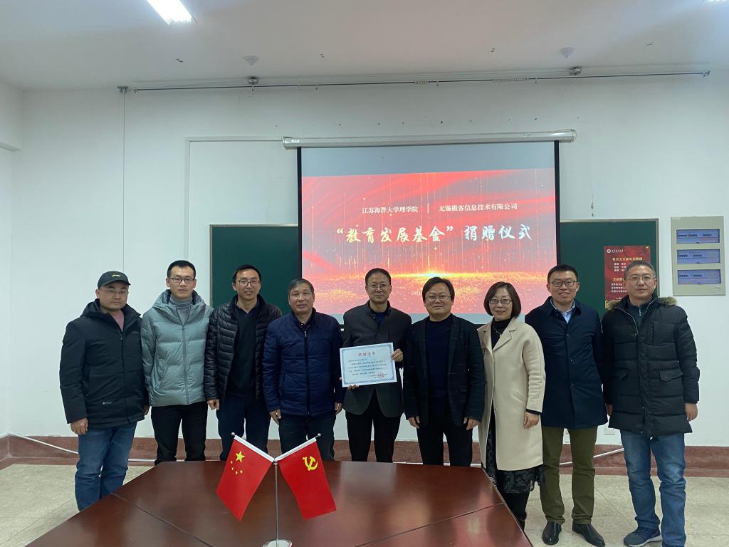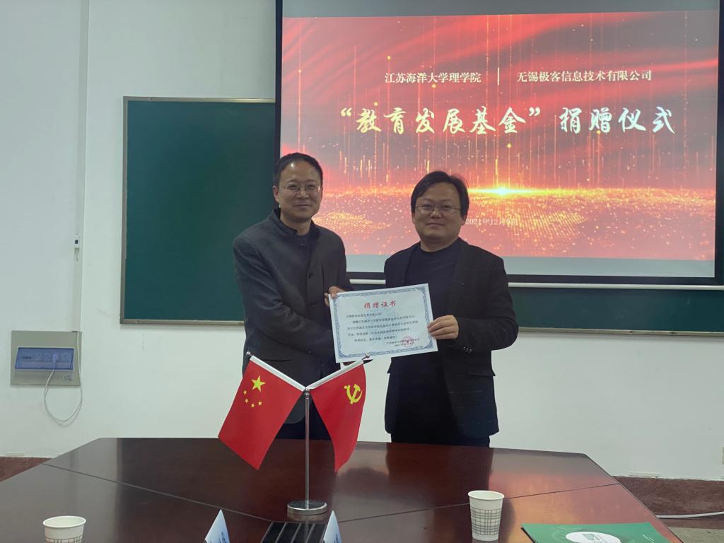 2021年12月9日下午,无锡极客信息技术有限公司在bevictor伟德官网捐赠设立教育发展基金,仪式在定海楼516举行。出席仪式的有无锡极客信息技术有限公司董事长董峰、市场总监董翔、教学总监何征天、市场部经理冯英华,公司党委书记赵季春、经理史林兴、副经理孙靖、副书记倪军、信息与计算科学系主任查明明参加捐赠仪式。