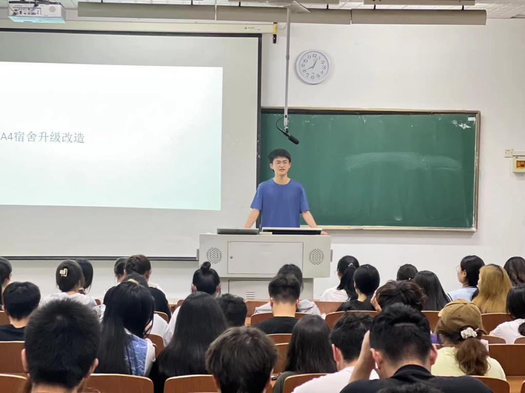 优秀宿舍长丁广生同学代表发言。他表示寝室长应以身作则,督促寝室同学遵守宿舍纪律,一起为营造安全、文明、和谐、整洁、舒适的寝室生活环境而努力。