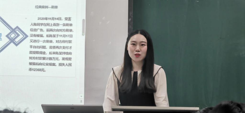 接着张慧婧老师进行法治安全宣讲,她介绍了各种诈骗的种类、诈骗的手段,结合近期发生的新型诈骗案例提醒同学们提高防范意识、保护人身财产安全。同时对于网络安全法、以及与宿舍相关的校纪校规进行讲解。最后,张老师讲述了近期公司在暑假将对A4女生宿舍进行修缮,希望大家能积极配合本次宿舍改造工作,并发放倡议书由大家共同签字。