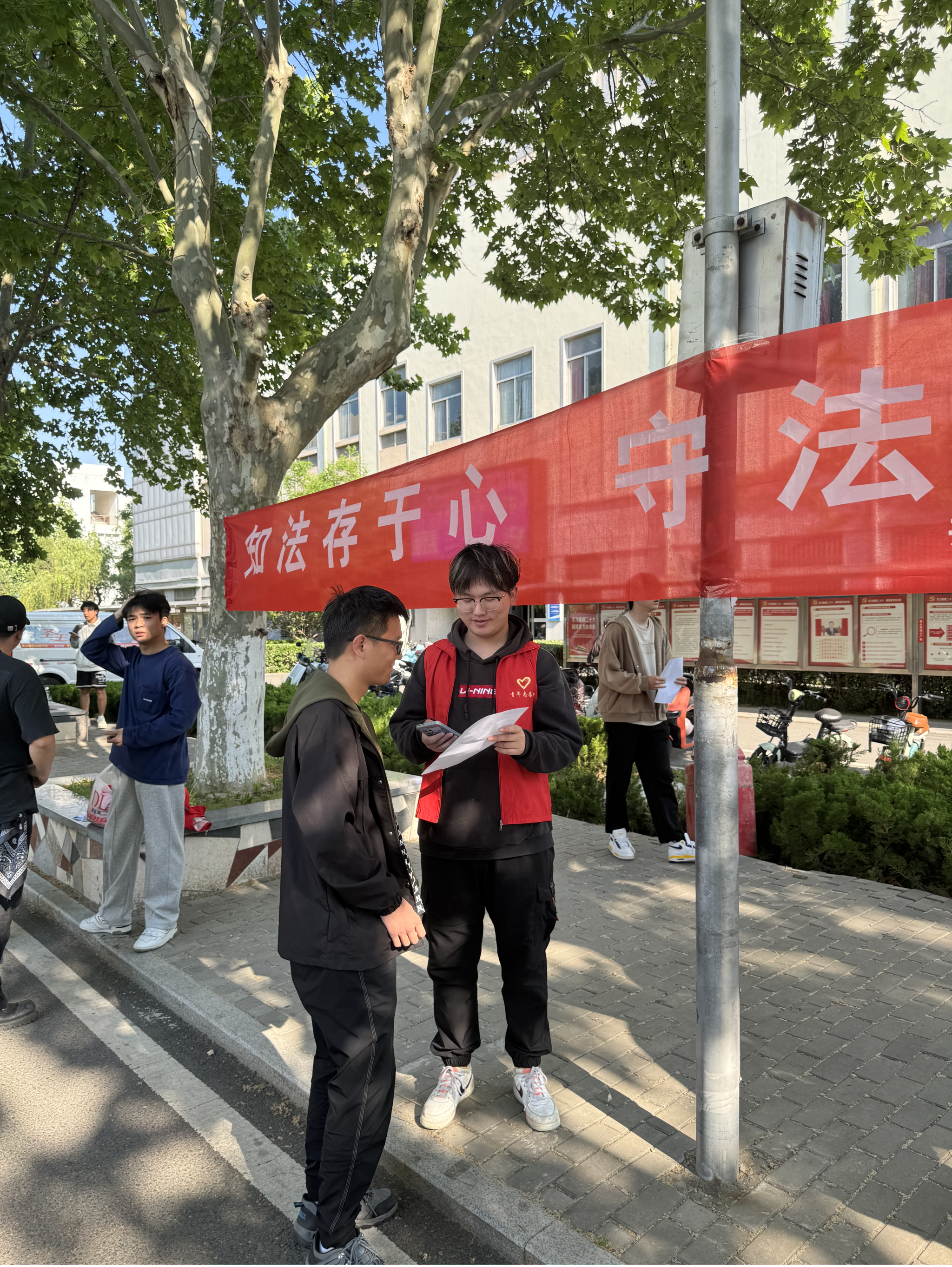 线下活动中,公司志愿者在校园里分发宣传海报,普及法律知识、弘扬法治精神。希望同学们知法存于心,守法律于行,能够更加生动地理解法律条文的含义,感受法律的庄严和权威。