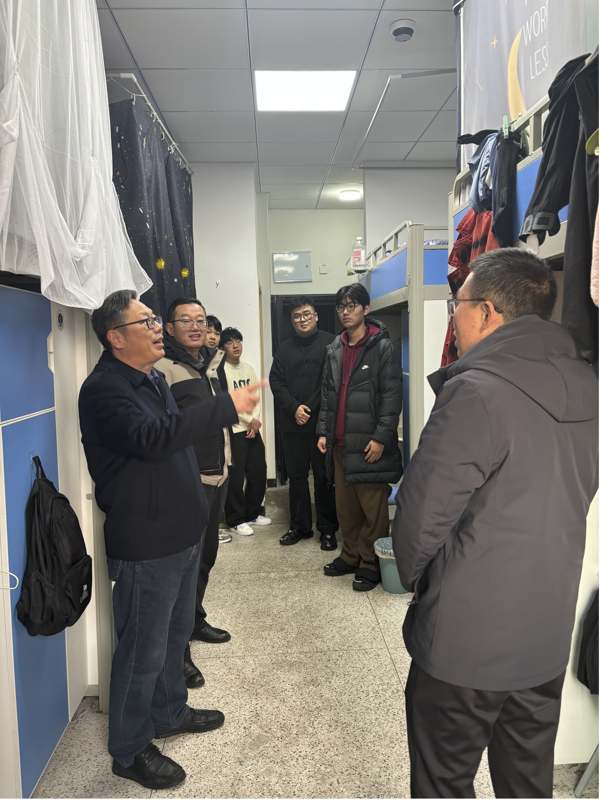 张振松一行来到研究生宿舍,仔细检查了宿舍卫生与安全状况,重点排查了电线、插排等可能存在的安全隐患,确保没有使用违规电器。此外,院领导还与研究生就近期生活、学业情况进行交流,叮嘱大家要注宿舍用水、用电安全,防范电信诈骗。