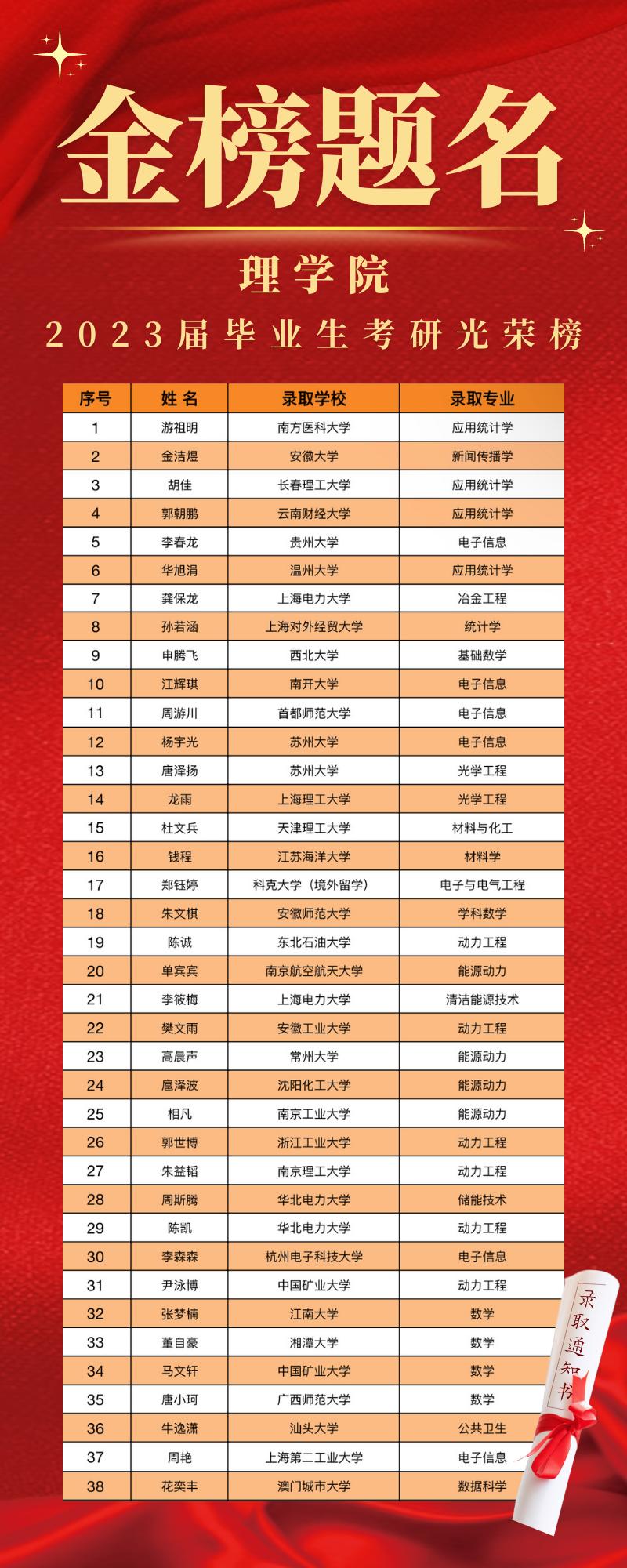 辛勤耕耘有矢志,硕果飘香又一年。2023年,公司考研学子喜报频传,成绩喜人。共有38名同学被南开大学、南京航空航天大学、南京理工大学、首都师范大学、中国矿业大学、苏州大学、华北电力大学、澳门城市大学等著名院校录取,录取人数占毕业生总数14.6%。